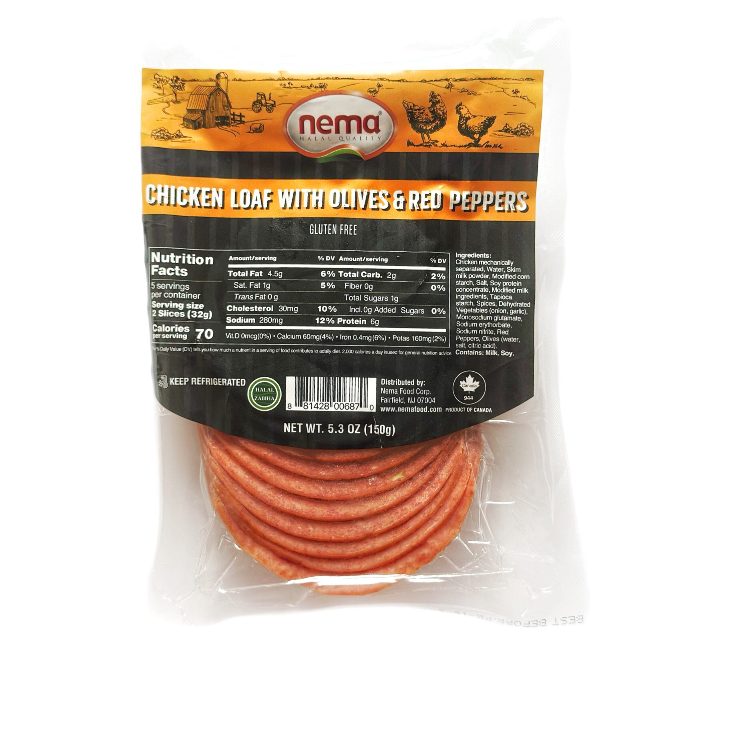 | Ingredients | Chicken mechanically separated, Water, Skim milk powder, Modified corn starch, Salt, Soy protein concentrate, Modified milk ingredients, Tapioca starch, Spices, Dehydrated Vegetables (onion, garlic), Monosodium glutamate, Sodium erythorbate, Sodium nitrite, Red Peppers, Olives (water, salt, citric acid). Contains: Milk, Soy. |